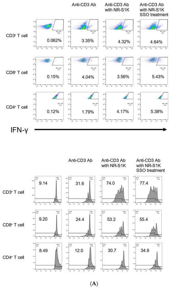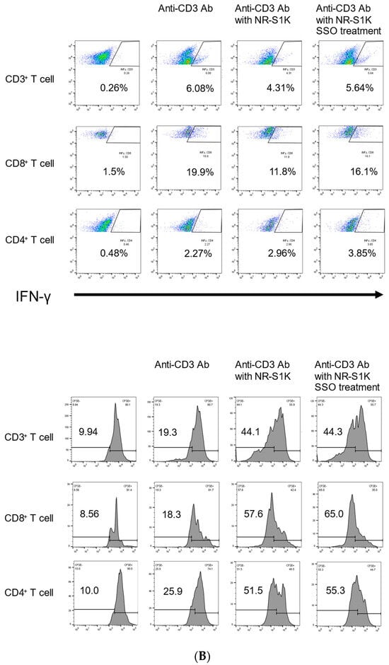 Augmented T cell responses by SSO-treated OSCCs. An in vitro Mixed Lymphocyte Reaction (MLR) assay was performed. NR-S1K cells were pretreated with 50μM SSO for 48 h. Then, lymph node cells (A) or spleen cells (B) from naive mice and NR-S1K cells (1 × 104) with or without SSO pretreatment were cocultured in a 96-well U-bottom culture plate in the presence of 0.5 μg/mL anti-CD3 for 72 h. Cells were restimulated with 50 ng/mL PMA, 500 ng/mL ionomycin, and 4 μM monensin for 4 h before the end of the culture. The intracellular IFN-γ of T cells was determined using flow cytometry. Experiments were performed three times and similar results were obtained. Representative scatter plots from one experiment are shown. Furthermore, CFSE-labeled T cells from lymph node cells (A) or spleen cells (B) were cocultured with NR-S1K cells with or without SSO pretreatment. T cells were gated with the same gating as in the experiment for IFN-γ levels. T cell proliferation was measured by CFSE dilution. Experiments were performed in triplicate and similar results were obtained. Representative histograms from one experiment are shown. In both experiments, the control is the figure in the second column from the right.