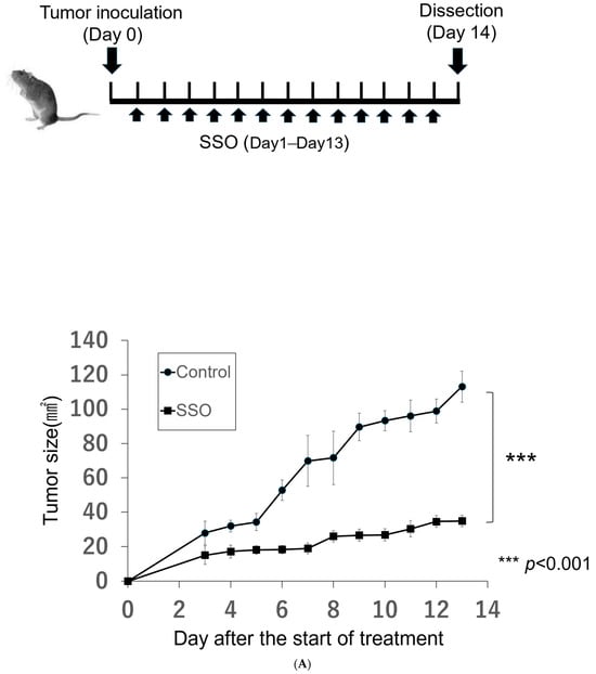 Growth inhibitory effect by SSO in a mouse model of OSCCs. Mice were challenged with NR-S1K cells. The mice were injected intraperitoneally with a dose of 20 mg/kg of SSO or saline every day from day 1 to day 13. (A) Tumor sizes in mice were measured at the indicated time points (n = 4/group); *** p < 0.01, NT vs. SSO. (B) Photos of tumor-bearing mice at the time of dissection. The upper images are of saline-treated control mice and the lower images are of SSO-treated mice.
