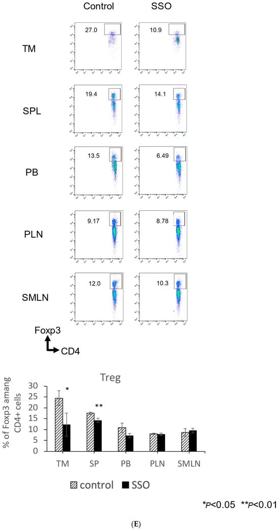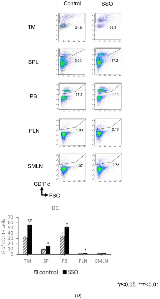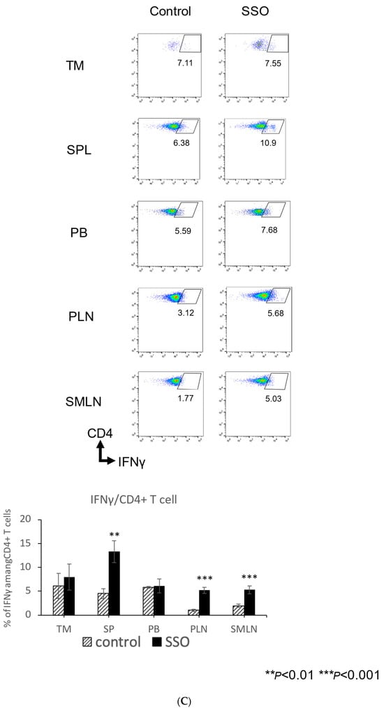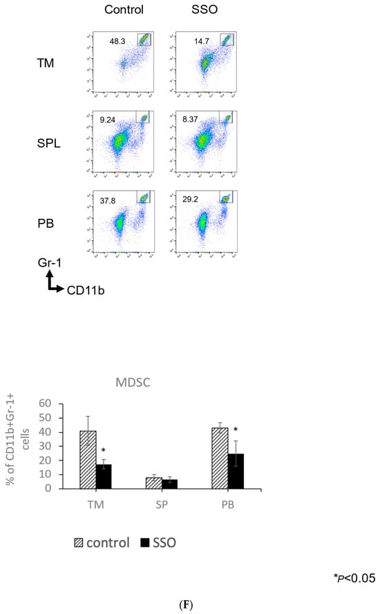 The comparison of the proportions of various immune cells in OSCC-bearing mice between the SSO-treated and non-treated populations. Mice were challenged with NR-S1K cells. The mice were injected intraperitoneally with a dose of 20 mg/kg of SSO every day from day 1 to day 13. After 14 days of tumor inoculation, the tumor, spleen, peripheral blood, peripheral lymph nodes, and submandibular lymph nodes were harvested and the percentages of various immune cells in each organ were determined using flow cytometry: (A) CD8+ T cells, CD4+ T cells, (B) IFN-γ-producing CD8+ T cells, (C) IFN-γ-producing CD4+ T cells, (D) Dendritic cells (DCs), (E) Regulatory T cells (Tregs), and (F) Myeloid-derived suppressor cells (MDSCs). Representative scatter plots and a summary of these results are shown (n = 3/group); * p < 0.05, ** p < 0.01, *** p < 0.001, NT vs. SSO. (TM: Tumor, SP: spleen, PB: peripheral blood, PLN: peripheral lymph nodes, and SMLN: submandibular lymph nodes).