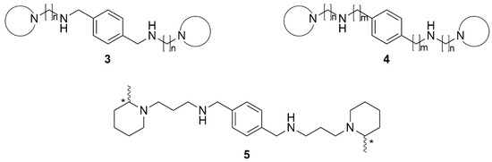 Our research group has also contributed to the field [13,14,15] by identifying CXCR4 inhibitors with general structure 3 (Figure 2). We have also re-examined if it was necessary to use the p-phenylene moiety as the central core to achieve high HIV-1 antiviral activities by synthesizing the more flexible structure 4 [16]. Among these tetraamine derivatives, compound 5 was identified as a hit compound showing promising activity in the in vitro Human CXCR4 Receptor Functional test (IC50 = 0.35 µM), compared to the reference compound 1 (IC50 = 0.26 µM). We synthesized the three stereoisomers of compound 5 (5(R,R), 5(S,S), and the meso form 5(S,R)) and evaluated their effect on glioma-initiating cells (GICs). The results indicated that compound 5 was effective in preventing tumor initiation and recurrence [17].