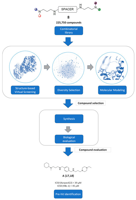General procedure for the discovery of novel CXCR4 inhibitors. The structure of tetraamines 8 was considered for the creation of the combinatorial library used in the structure-based virtual screening of potential CXCR4 inhibitors. Diversity selection and molecular modeling were used for the identification of those compounds to be synthesized and biologically tested. Finally, compound A{17,18} was identified as a pre-hit.