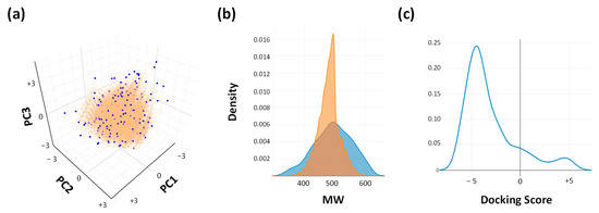 (a) Projection of the assessed combinatorial library on the first two principal components. Selected compounds are colored in blue and the space described by the full combinatorial library is in orange. (b) Molecular weight distribution for both sets. (c) Density distribution of docking scores obtained for the selected molecules.