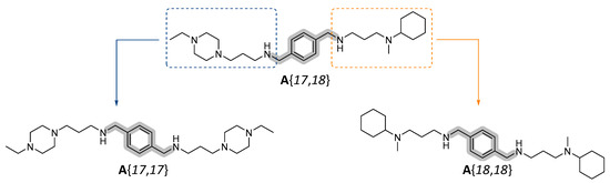 A thorough analysis of the synthetic feasibility of selected candidates led us to the identification of compound A{17,18} as the most accessible compound. Note that this compound is a non-symmetrical molecule, composed of the A spacer and amines identified as 9{17} and 9{18} (and consequently referred to as A{17,18}). The symmetrical compounds would correspond to A{17,17} and A{18,18} (Figure 5).