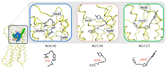 Induced fit docking followed by molecular dynamics simulation was applied to the selected candidates to evaluate the preferred interaction mechanism with the receptor, considering the molecular flexibility (Figure S2). According to the computational results, although all compounds would mainly interact with the CXCR4 orthosteric binding site (Figure 6), A{18,18} would show slightly higher affinity for CXCR4 (S = −7.9 kcal/mol, LE = −0.25) than A{17,18} (S = −7.5 kcal/mol, LE = −0.23) or A{17,17} (S = −6.8 kcal/mol, LE = −0.21). Interestingly, the presence of an N-methylcyclohexanamine fragment (amine 9{18}) would promote a better hydrophobic contact with CXCR4, leading to a curved conformation in which both terminal fragments interact with the inner side of the binding pocket. The intramolecular distance between the two terminal cycles increases progressively when changing the terminal amine 9{18} to 9{17}, showing a decrease in the ability to interact with the internal part of the site (Figure 6). Our results suggest that 9{18} could interact in the CXCR4 subpocket close to the TM2 helix, abutting Trp 94, and extend the interaction to a second subpocket. Depending on the amine on the opposite side of the molecule, the ligand would tend to interact with the TM7 region (Glu 452) in the case of A{18,18} or towards the outside region (Asp187) near TM4 and TM5 in the case of A{17,18}.