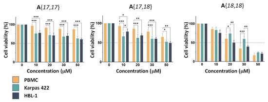 Once the symmetrical compounds A{17,17} and A{18,18} and the non-symmetrical compound A{17,18} were synthesized, their antitumor activity and selectivity were assessed using the MTT assay in a DLBCL cell line of the activated B-cell (ABC) subtype (HBL-1) and in a second cell line of the germinal center B-cell (GBC) subtype (Karpas-422). In parallel, selectivity toward tumor B-cells was evaluated by culturing primary human peripheral blood mononuclear cells (PBMCs) purified from three healthy donors in the same conditions.