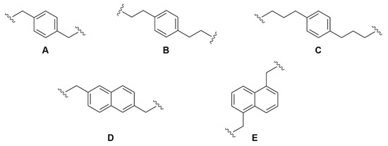 Attending the general structure 8, a total of five symmetrical spacers (A–E) was considered, including dialkyl disubstituted phenyl or naphthyl rings, taking into account the previous experience of our research group [13,14,15] (Figure 8).