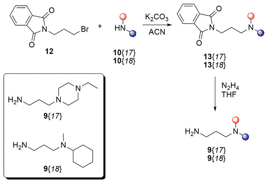 First, we synthesized diamines 9{17} and 9{18} from the corresponding cyclic amines N-ethylpiperazine 10{17} and N-methylcyclohexanamine 10{18} (Scheme 1). Thus, amines 10{17} and 10{18} were treated with N-(3-bromopropyl)phthalimide (12) in the presence of K2CO3 as the base in acetonitrile to afford the corresponding phtalimides 13{17} and 13{18} in 85% and 75% yield, respectively. These later compounds were transformed into the desired diamines 9{17} and 9{18} upon treatment with hydrazine in EtOH in 85% and 42% yield, respectively.
