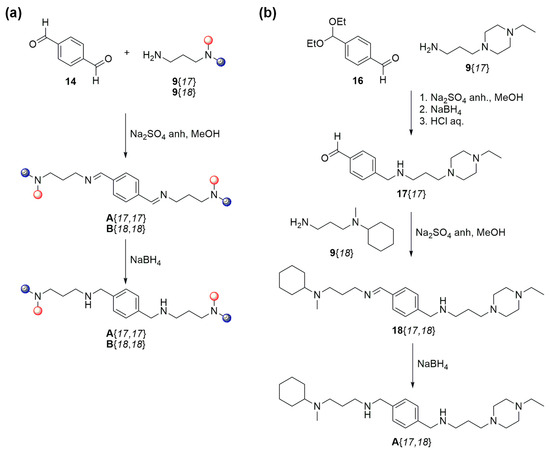 On the one hand, the symmetrical tetraamines A{17,17} and A{18,18} were synthesized (Scheme 2a) by using the same protocol described for the synthesis of 5 [13], in which terephtaldehyde (14) was treated with two equivalents of the corresponding diamines 9{17} and 9{18} in EtOH at 120 °C and Na2SO4 as the dehydrating agent to afford the corresponding diimines 15{17,17} and 15{18,18}, which are directly converted to the desired tetraamines A{17,17} and A{18,18} upon treatment with NaBH4 in 51% and 85% yield, respectively.