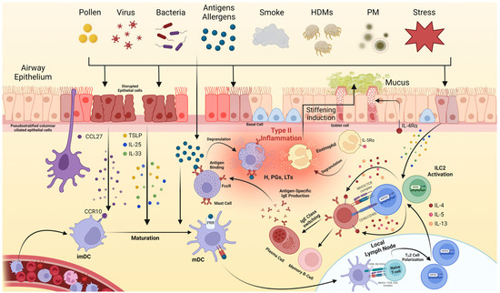 IgE released from plasma cells binds to the IgE receptor (FcεR) on mast cell membranes through a process known as sensitization in allergic responses. As IgE bound to mast cells is specific to certain antigens or allergens, when these antigens or allergens re-enter the disrupted epithelial cells, they directly bind to the IgE on mast cells. This cross-linking triggers mast cell degranulation, releasing inflammatory molecules, such as histamines, prostaglandins, and leukotrienes [30]. These factors ultimately induce inflammatory symptoms, such as coughing, sneezing, and airway congestion [17]. Figure 1 illustrates the overall immunological pathogenic mechanism of T2AI.