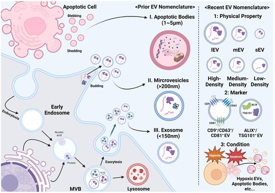 EVs are secreted by donor cells through various biological processes and they are primarily classified into apoptotic bodies (ApoBDs), micro-vesicles, and exosomes based on their cell of origin and vesicle size [31,32,33]. ApoBDs (diameter: 1–5 µm) are vesicles shed from apoptotic cells during programmed cell death. They contain proteins, lipids, and genetic materials, such as mRNAs, micro-RNAs (miRNAs), and other cellular organelles [31]. These vesicles are formed by a tightly regulated process, called apoptotic cell disassembly, which involves plasma membrane blebbing, formation of apoptotic protrusions, and fragmentation into ApoBDs [34]. ApoBDs are produced by dying cells, whereas micro-vesicles and exosomes are formed via the budding or exocytosis of living cells.
