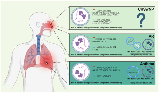 Comprehensive applications of EVs for various T2AI diseases. EVs exhibit differentially expressed molecules in chronic rhinosinusitis with nasal polyps (CRSwNP), allergic rhinitis (AR), and asthma and can be applied for the diagnosis of these conditions. Specifically, mesenchymal stromal cells (MSCs) and adipose tissue-derived stem cells (ADSCs)-derived EVs are potential therapeutic targets for AR and asthma. ↑: Up-regulation, ↓: Down-regulation.