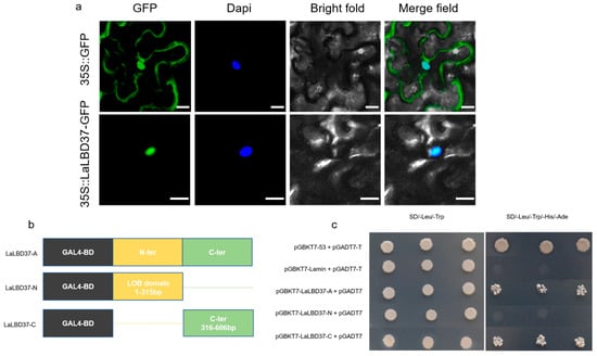 Analysis of subcellular localization and transcriptional activation activity of LaLBD37. (a) Nuclear localization of LaLBD37; (b) The division of N- and C-terminal regions of LaLBD37; (c) Transcriptional activation assay. Scale bar, 20 µm.
