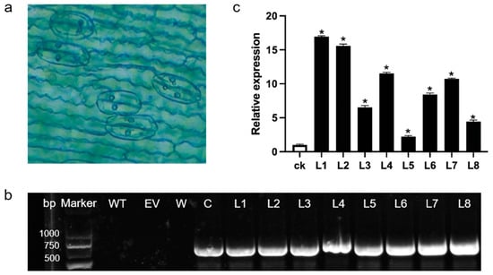 Validation of transgenic ‘Sorbonne’ seedlings. (a) GUS detection in ‘Sorbonne’ transgenic LaLBD37 resistant plants; (b) PCR detection of ‘Sorbonne’ resistant plants. WT: Untransformed ‘Sorbonne’ plants; EV: Empty vector-transformed ‘Sorbonne’ plants; W: Water; C: Carrier vector; (c) Quantitative analysis of LaLBD37 in ‘Sorbonne’ positive plants; each group of data was the mean of three repetitions; ck: empty vector-transformed ‘Sorbonne’ line; L1–L8: LaLBD37-transformed ‘Sorbonne’ lines; * represents significant difference (p < 0.05).