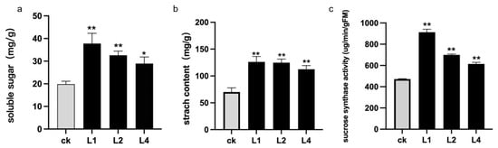 Phenotypic observation and scale count of transgenic ‘Sorbonne’. (a) The change of soluble sugar content in LaLBD37 transgenic lines; (b) The change of starch content in LaLBD37 transgenic lines; (c) The change of sucrose synthase activity in LaLBD37 transgenic lines; each group was the average of three repetitions; ck: empty vector-transformed ‘Sorbonne’; L1, L2, and L4: lines with high expression of LaLBD37 in ‘Sorbonne’; * representing significant difference (p < 0.05); ** represents significant difference (p < 0.01).