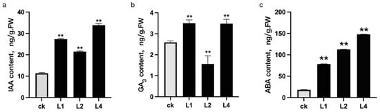 Determination of endogenous hormone content in LaLBD37 overexpression lines at the same time. (a) The IAA content in LaLBD37 transgenic lines; (b) The GA3 content in LaLBD37 transgenic lines; (c) The ABA content in LaLBD37 transgenic lines; each group was the average of three repetitions; ck: empty vector-transformed ‘Sorbonne’; L1, L2, and L4: lines with high expression of LaLBD37 in ‘Sorbonne’; ** represents significant difference (p < 0.01).