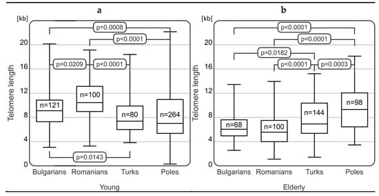 While in young study groups (Figure 1a), Romanians (n = 100) had the longest telomere length (mean telomere length was 9.05 ± 4.35 kb) as compared to young individuals from Bulgaria (n = 121; mean telomere length was 7.89 ± 2.68 kb; p = 0.0209), Turkey (n = 80; mean telomere length was 6.93 ± 2.68 kb; p < 0.0001), and Poland (n = 264; mean telomere length was 7.41 ± 4.35; p < 0.0001). Moreover, some significant relationships were observed between young Bulgarians compared to young Turks (p = 0.0143) and young Poles (p = 0.0008).