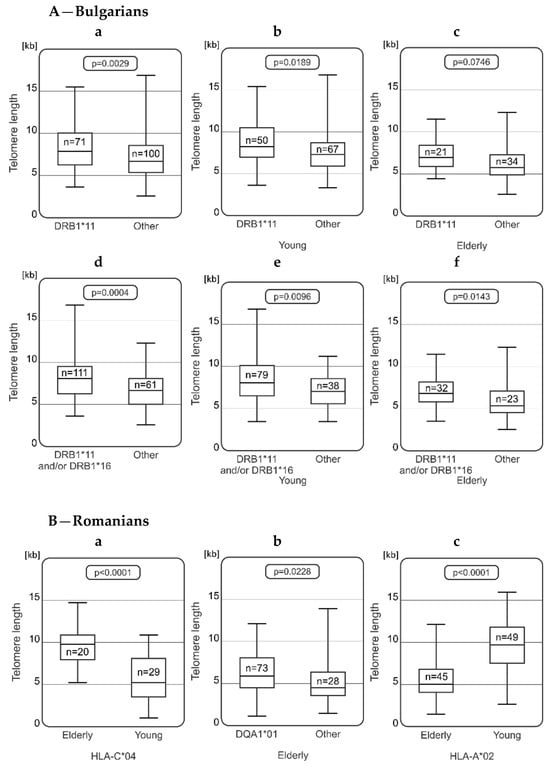 In the Bulgarian population, an association between telomere length and the presence of HLA-DRB1 alleles was observed (Figure 2Aa). Longer telomeres were detected in Bulgarians carrying HLA-DRB1*11 and/or DRB1*16 alleles (Figure 2Ad). DRB1*11 was associated with longer telomere length in all studied Bulgarians (n = 71; mean telomere length was 8.25 ± 2.60 kb vs. 7.05 ± 2.49 kb; p = 0.0029). This relationship was observed in young Bulgarians (n = 50; 8.65 ± 2.73 kb vs. 7.47 ± 2.52 kb; p = 0.0189; (Figure 2Ab)), and the trend was noticed in elderly Bulgarians (n = 21; 7.29 ± 2.01 vs. 6.21 ± 2.21 kb; p = 0.0746; (Figure 2Ac)). Furthermore, Bulgarians carrying HLA-DRB1*11 and/or DRB1*16 were found with significantly longer telomeres than individuals with other HLA-DRB1 alleles (for all analyzed Bulgarians (Figure 2Ad), mean telomere length was 8.07 ± 2.68 kb, p = 0.0004; for the young group, 8.45 ± 2.83 kb vs. 6.97± 1.97 kb, p = 0.0096 (Figure 2Ae); and for the elderly, 7.13 ± 2.02 kb vs. 5.92 ± 2.24 kb, p = 0.0143 (Figure 2Af)).
