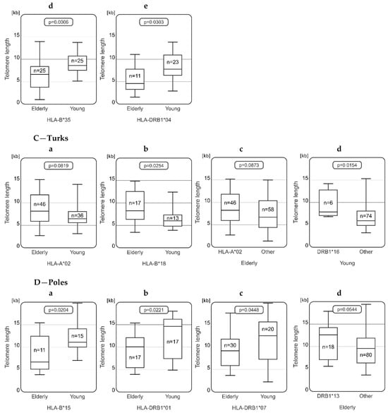 Significant associations between telomere length and HLA alleles, detected in elderly and young representatives of the studied populations. A—Bulgarians carrying HLA-DRB1*11 and/or DRB1*16 have significantly longer telomeres than individuals with other HLA-DRB1 alleles (a,d) and this relationship is observed in both young (b,e) and elderly Bulgarians (c,f). B—Among Romanians, longer telomeres were detected in the HLA-C*04-positive elderly group as compared to young group carrying HLA-C*04 (a), and in elderly Romanians with DQA1*01 as compared to elderly young Romanians lacking these DQA1 alleles (b); young Romanians carrying the HLA-A*02 (c), HLA-B*35 (d), and HLA-DRB1*04 (e) alleles, characterized by longer telomeres than elderly Romanians carrying these HLA alleles. C—Healthy elderly Turks carrying HLA-A*02 (a) and B*18 (b) had longer telomeres than the young group; longer telomers were also detected in A*02-positive than in A*02-negative elderly Turks (c) and in DRB1*16-positive than in DRB1*16-negative young representatives of the Turkish population (d). D—young Poles carrying HLA-B*15 (a), DRB1*01 (b), and DRB1*07 (c) have longer telomeres than healthy elderly Poles carrying these alleles; moreover, a tendency was observed for differences in telomere length among healthy elderly Poles carrying or lacking DRB1*13 (d). n—indicates the number of healthy elderly or young individuals carrying a given HLA allele/genotype.