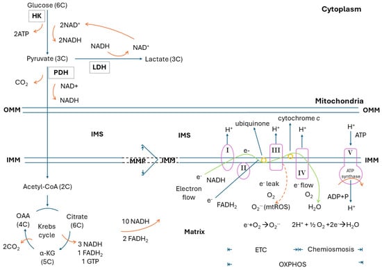 Glucose metabolism through glycolysis, Krebs cycle and OXPHOS to generate ATP, as well as electron leak and mtROS generation, are illustrated. α-KG: alpha-ketoglutarate; FAD: oxidized flavin adenine dinucleotide; FADH2: reduced flavin adenine dinucleotide; HK: hexokinase; IMM: inner mitochondrial membrane; IMS: intermembrane space; LDH: lactate dehydrogenase; MMP: mitochondrial membrane potential; mtROS: mitochondrial ROS; NAD+: oxidized nicotinamide adenine dinucleotide; NADH: reduced nicotinamide adenine dinucleotide; OAA: oxaloacetate; OMM: outer mitochondrial membrane; OXPHOS: oxidative phosphorylation; PDH: pyruvate dehydrogenase; ROS: reactive oxygen species.