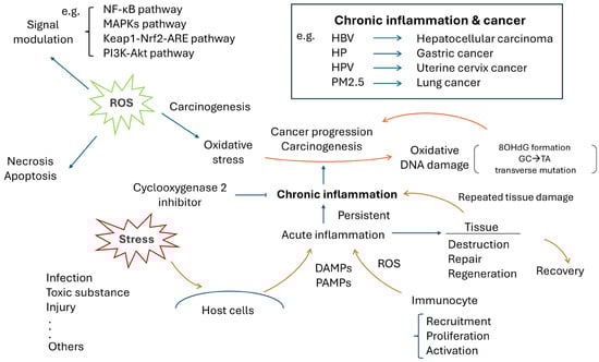 A persistent inflammation can cause repeated tissue damage, tissue repair and tissue regeneration, which evolve into a slowly “burning status” and become a chronic inflammation. Previous studies demonstrated that chronic inflammation can cause oxidative DNA damage to form 8-hydroxy-2′-deoxyguanosine (8-OHdG), which might become carcinogenetic []. This scenario is supported by the clinical evidence of the relation between Helicobacter pylori (HP) and gastric cancer [], Clonorchis sinensis and cholangiocarcinoma [], human papillomavirus (HPV) and cervical cancer [], hepatitis B virus (HBV) and hepatocellular carcinoma (HCC) [], sun exposure and skin cancer [] or particulate matters ≤ 2.5 µm (PM2.5) in air pollutants and lung cancer []. On the other hand, the anticancer effect elicited by an anti-inflammation therapy, the cyclooxygenase 2 inhibitor, has further supported this viewpoint []. An imbalance or disturbance between pro- and anti-inflammation might play an important role in cancer formation and progression. Thus, ROS-associated oxidative damages is speculated to be a major contributor that links chronic inflammation and carcinogenesis [].