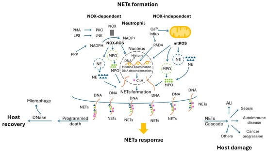 This type of NET formation mainly depends on ROS produced by NOX. After assembling, NOX enzymes oxidize NADPH to generate ROS, which can disintegrate the membrane of cytoplasmic granules, mainly NE and MPO, and the membrane of the nucleus. The free NE and MPO thus enter the nucleus and cleave the histone to de-condensate chromatin. Decorated with NE, MPO or other granular enzymes, the de-condensated DNA can be released to the extracellular environment as NETs to execute their anti-microbial function [].