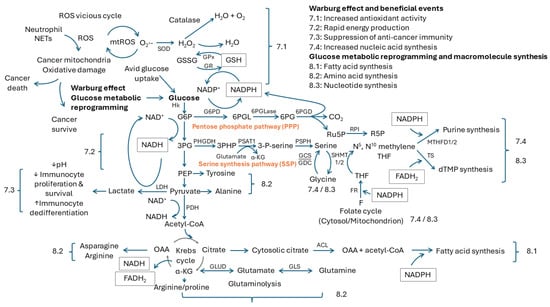 Illustration of NETs, ROS, cancer mitochondrial oxidative damage and altered glucose metabolism, including the Warburg effect and glucose metabolic reprogramming, in human cancers is shown. Beneficial events from the Warburg effect are sketched and described in text sections, including 7.1: Increased antioxidant activity, 7.2: Rapid energy production, 7.3: Suppression of anticancer immunity and 7.4: Increased nucleic acid synthesis. Synthesis of macromolecules through glucose metabolic reprogramming is illustrated and described in text sections, including 8.1: Fatty acid synthesis, 8.2: Amino acid synthesis and 8.3: Nucleotide synthesis. 3PG: 3-phosphoglycerate; 3PHP: 3-phosphate hydroxypyruvate; 3-P-serine: 3-phosphoserine; 6PGD: 6-phosphogluconate dehydrogenase; 6PGL: 6-phosphogluconolactone; ACL: ATP-citrate lyase; α-KG: alpha-ketoglutarate; F: Folate; FADH2: reduced flavin adenine dinucleotide; FR: folate reductase; G6P: glucose-6-phosphate; G6PD: glucose 6-phosphate dehydrogenase; GCS: Glycine cleavage system; GDS: glycine decarboxylase complex; GLS: glutaminase; GLUD: glutamate dehydrogenase; GPx: glutathione peroxidase; GR: glutathione reductase; GSH: reduced glutathione; GSSG: oxidized glutathione; HK: hexokinase; LDH: lactate dehydrogenase; MTHFD: methylenetetrahydrofolate dehydrogenase/cyclohydrolase; mtROS: mitochondrial ROS; NAD+: oxidized nicotinamide adenine dinucleotide; NADH: reduced nicotinamide adenine dinucleotide; NADP+: oxidized nicotinamide adenine dinucleotide phosphate; NADPH: reduced nicotinamide adenine dinucleotide phosphate; NETs: neutrophil extracellular traps; OAA: oxaloacetate; PDH: pyruvate dehydrogenase; PEP: phosphoenolpyruvate; PHGDH: phosphoglycerate dehydrogenase; PPP: pentose phosphate pathway; PSAT1: phosphoserine aminotransferase; PSPH: 1–3-phosphoserine phosphatase; R5P: ribose 5-phosphate; ROS: reactive oxygen species; RPI: 5-phosphate isomerase; Ru5P: ribulose 5-phosphate; SHMT: serine hydroxymethyl transferase; SOD: superoxide dismutase; SSP: serine synthesis pathway; THF: tetrahydrofolate; TS: thymidylate synthase.