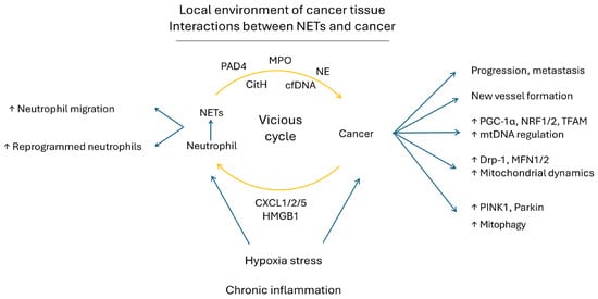 Local environment and the interactions between NETs and cancer are illustrated. CitH: citrullinated histone; cfDNA: cell free DNA; CXCL1/2/5: chemokine C-X-C motif ligand 1/2/5; Drp1: dynamin-related protein 1; HMGB1: high mobility group box 1; MFN1/2: mitofusin 1/2; MPO: myeloperoxidase; mtDNA: mitochondrial DNA; NE: neutrophil elastase; NETs: neutrophil extracellular traps; NRF1/2: nuclear respiratory factor 1/2; PAD4: protein arginine deiminase 4; PGC-1α: peroxisome proliferators-activated receptor gamma coactivator-1α; PINK1: PTEN-induced kinase 1; TFAM: mitochondrial transcription factor A.