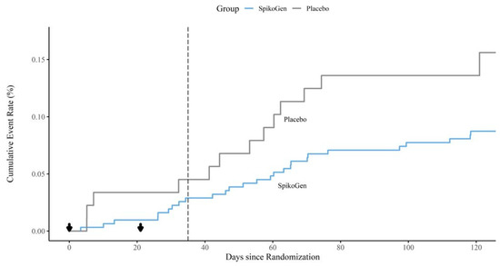 Kaplan Meir curve showing cumulative SARS-CoV-2 infections in SpikoGen® and placebo groups. Black down arrows indicate the timing of the first and second vaccine or placebo dose. The dotted line represents two weeks post-second dose, the normal point from which infections counting towards COVID-19 vaccine efficacy are accrued.