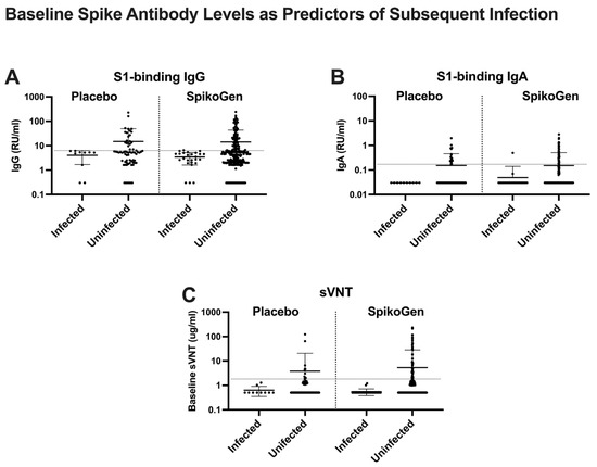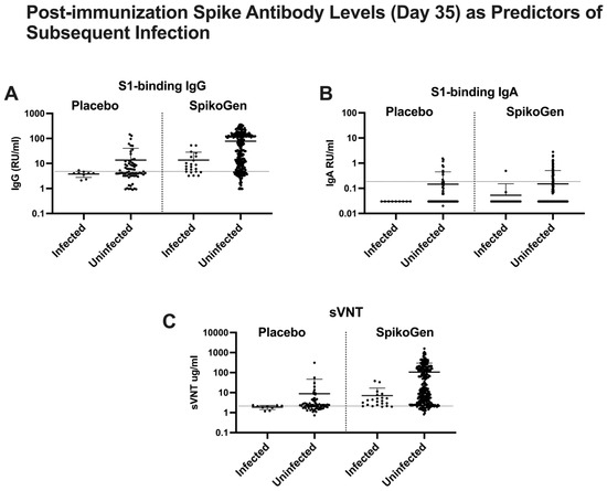 Spike antibody levels (serum S1-binding IgG (A), S1-binding IgA (B), and surrogate virus neutralization test (sVNT) (C)) measured two weeks after the 2nd SpikoGen® or placebo dose (Day 35) in participants who subsequently either did or did not have a documented SARS-CoV-2 infection during 3 months of follow-up. Mean plus standard deviation. The horizontal dotted line on each figure indicates the seropositive cutoff of each assay.