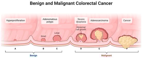 Conventional adenoma–carcinoma sequence pathway of colorectal cancer development. (A) The first stage involves hyperproliferation, where there is an increased rate of cell division and growth within the colonic epithelium. This is depicted as a slight thickening of the epithelial lining. (B) As the process progresses, small adenomatous polyps begin to form. These polyps are benign growths protruding into the colonic lumen and are represented as small, spherical structures attached to the epithelial lining. (C) Over time, some of these small polyps can grow larger, forming large adenomatous polyps. These are shown as larger spherical masses connected to the colonic wall. (D) Within these larger polyps, severe dysplasia occurs, characterized by abnormal cell growth and organization. This stage is visually depicted by the presence of an irregular, yellow-colored growth within the polyp structure. (E) The dysplastic cells in the polyp can then transform into an adenocarcinoma, which is an invasive malignant tumor. This stage is represented by a large, irregularly shaped mass protruding into the colonic lumen, with a distinct boundary separating it from the surrounding normal tissue. (F) In the final stage, the adenocarcinoma has progressed to a full-blown colorectal cancer. This is depicted as a large, irregular mass filling a significant portion of the colonic lumen, indicating advanced tumor growth and invasion. Figure created using BioRender (https://www.biorender.com/ accessed on 29 July 2024).