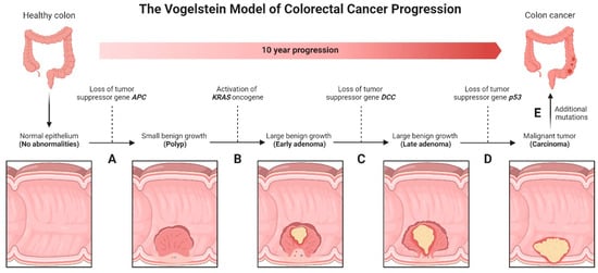 The conventional adenoma–carcinoma sequence is a widely accepted model that explains the development of CRC from benign polyps called adenomas []. It describes a stepwise progression from normal colorectal tissue to adenomas and ultimately to invasive carcinoma (Figure 1) []. The process begins with the normal lining of the colon or rectum []. Genetic mutations occur within the cells of the colorectal tissue []. These mutations are often acquired due to various factors such as environmental exposures (i.e., diet, smoking) or inherited genetic predispositions []. The initiated cells begin to undergo abnormal growth and form benign polyps called adenomas which can vary in size and shape []. Over time, some adenomas may progress to a stage called dysplasia []. Dysplasia refers to the presence of abnormal cells within the adenoma, which have acquired additional genetic alterations []. High-grade dysplasia indicates a more advanced stage with a greater likelihood of becoming cancerous []. If left untreated, some dysplastic adenomas can transform into invasive carcinoma, where the abnormal cells invade through the layers of the colon or rectum and potentially spread to nearby lymph nodes or distant organs [].