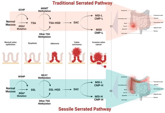 The serrated neoplasia routes. (A) The traditional serrated pathway begins with a KRAS mutation in normal colonic mucosa, leading to the formation of a traditional serrated adenoma (TSA). Further MGMT methylation and other TSG (tumor suppressor gene) methylation events promote the progression to TSA-HGD (traditional serrated adenoma–high grade dysplasia). Subsequent accumulation of genetic alterations results in the development of serrated adenocarcinoma (SAC), which can exhibit either an MSI-L/CMP-L (microsatellite instability–low/CpG island methylator phenotype–low) or MSS/CMP-L (microsatellite stable/CpG island methylator phenotype–low) molecular profile, indicative of invasive colorectal cancer (CRC). (B) The sessile serrated pathway initiates with a BRAF mutation in normal colonic mucosa, leading to the formation of sessile serrated lesions (SSL). Further MLH1 methylation and other TSG methylation events promote the progression to SSL-HGD (sessile serrated lesion–high grade dysplasia). Subsequent accumulation of genetic alterations results in the development of serrated adenocarcinoma (SAC), which can exhibit either an MSI-L/CMP-H (microsatellite instability–low/CpG island methylator phenotype–high) or MSI-H/CMP-H (microsatellite instability–high/CpG island methylator phenotype–high) molecular profile, indicative of invasive CRC. Figure created using BioRender.