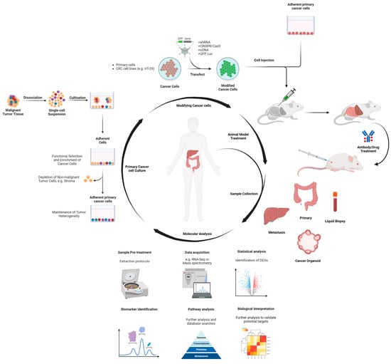 The study of CRC subtypes encompasses various approaches to capture their versatile features (Figure 5). These approaches involve the utilization of different model systems, including chemically induced and genetically engineered mouse models [], patient-derived cell lines [], organoids [], and xenografts []. Each of these study models offers distinct advantages and allows researchers to explore specific aspects attributable to CRC subtypes [,,]. Chemically induced mouse models involve the manipulation of mice through chemical carcinogenic agents such as azoxymethane (AOM) [,,,] or dextran sulfate sodium (DSS) [,] to induce CRC []. Similarly, genetically engineered mouse models (GEMMs) are created by introducing specific genetic alterations relevant to CRC development []. These models are more physiologically relevant to CRC and enable researchers to study the fundamental mechanisms driving cancer initiation, progression, and response to treatment [].