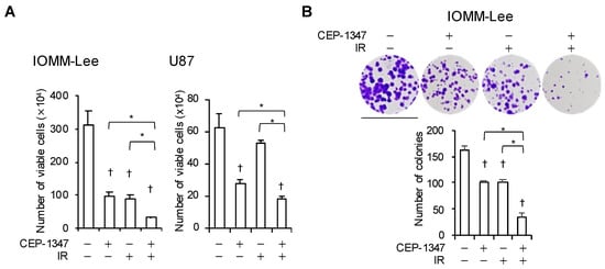 We previously reported that CEP-1347 inhibited the growth of GBM and MM cells, which are typical malignant brain tumor cells with the wild-type p53 gene [,]. In the present study, we used the MM cell line IOMM-Lee and the GBM cell line U87 with wild-type p53. The treatment with CEP-1347 inhibited the proliferation of these cells, as previously reported. In addition, a single exposure to IR of IOMM-Lee at a dose of 2 Gy and U87 at 4 Gy suppressed their proliferation. We then investigated whether the combination of the CEP-1347 treatment and IR was effective. We found that the growth of both cell types was more strongly inhibited by the CEP-1347 treatment followed by IR than by either treatment alone (Figure 1A). Furthermore, the combination suppressed clonal survival significantly more than either treatment alone (Figure 1B). These results suggest that the CEP-1347 treatment enhanced the inhibitory effects of IR on the proliferation of malignant brain tumor cells.