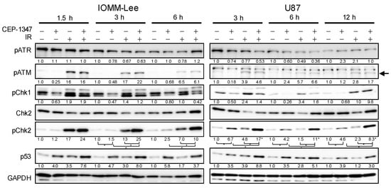 CEP-1347 promotes the phosphorylation of Chk2, but not that of ATM, induced by ionizing radiation (IR). IOMM-Lee and U87 cells treated without or with CEP-1347 (250 nM for IOMM-Lee and 400 nM for U87) for 1 day (IOMM-Lee) and 2 days (U87) were not irradiated or were irradiated once by X-ray (IR, 2 Gy for IOMM-Lee and 4 Gy for U87). After being cultured for the indicated hours, cells were subjected to a Western blot analysis. The band specific to phospho-ATM (pATM) is indicated by an arrow. The numbers below the Western blot images represent the means of the relative band intensities after each band was quantified by densitometry and normalized by the GAPDH value. * p < 0.05.