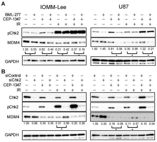 A previous study reported that IR-induced decreases in MDM4 expression in sarcoma cells occurred in a Chk2-dependent manner []. Figure 3A,B show that MDM4 expression was decreased in IOMM-Lee and U87 treated with CEP-1347 or IR; however, it remains unclear whether the underlying molecular mechanisms are dependent on Chk2. Therefore, we investigated whether the reduction in MDM4 expression by the CEP-1347 treatment, IR, or their combination was dependent on Chk2 using a Chk2 inhibitor or its knockdown. In both cell types, the inhibition of Chk2 markedly attenuated the IR-induced decrease in MDM4 expression, but only slightly ameliorated, or did not affect, the reduction caused by CEP-1347 or the combined treatment (Figure 6A,B).