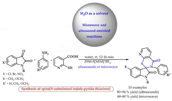 - Arya, K.; Rawat, D.S.; Sasai, H. Zeolite supported brønsted acid ionic liquids: An eco approach for synthesis of spiro[indolepyrido[3,2-e]thiazine] in water under ultrasonication. Green Chem. 2012, 14, 1956–1963. [Google Scholar] [CrossRef]