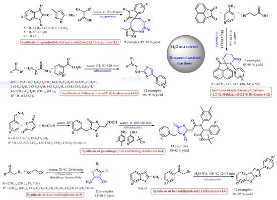 - Pagadala, P.; Kasi, V.; Shabalala, N.S.; Jonnalagadda, S.B. Ultrasound-assisted multicomponent synthesis of heterocycles in water—A review. Arab. J. Chem. 2022, 15, 103544. [Google Scholar] [CrossRef]