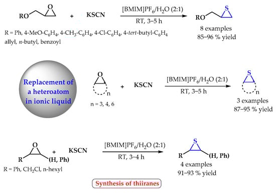 - Yadav, J.S.; Reddy, B.V.S.; Srinivas, C.; Rajasekhar, K. [Bmim]PF6: A novel and recyclable ionic liquid for conversion of oxiranes to thiiranes in aqueous media. J. Org. Chem. 2003, 68, 2525–2527. [Google Scholar] [CrossRef] [PubMed]