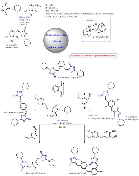 - Arafa, W.A.A.; Mourad, A.K. New dicationic DABCO-based ionic liquids: A scalable metal-free one-pot synthesis of bis-2-amino-5-arylidenethiazol-4-ones. R. Soc. Open. Sci. 2019, 6, 190997. [Google Scholar] [CrossRef] [PubMed]