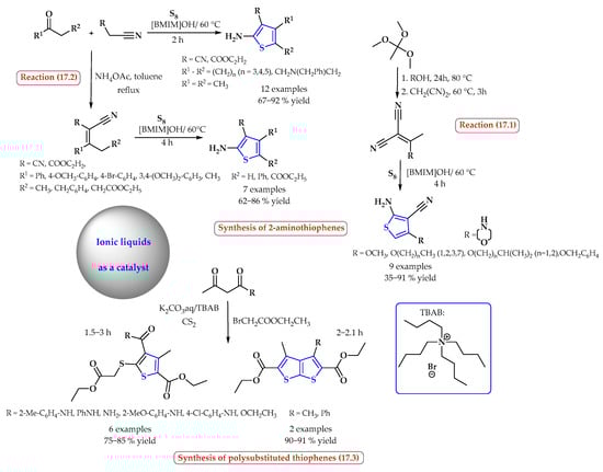 - Kaki, V.R.; Akkinepalli, R.R.; Deb, P.K.; Pichika, M.R. Basic ionic liquid [bmIm]OH mediated Gewald reaction as green protocol for the synthesis of 2-aminothiophenes. Synth Commun. 2015, 45, 119–126. [Google Scholar] [CrossRef]