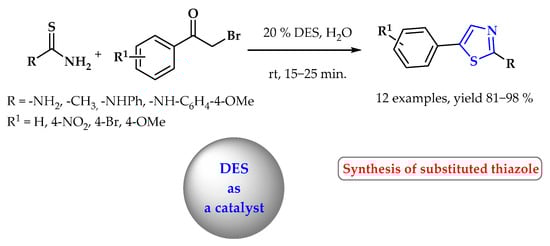 - Lobo, H.R.; Singh, B.S.; Shankarling, G.S. Lipase and deep eutectic mixture catalyzed efficient synthesis of thiazoles in water at room temperature. Catal. Lett. 2012, 142, 1369–1375. [Google Scholar] [CrossRef]