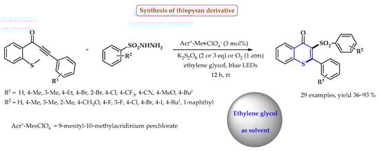 - Jiang, Y.-Q.; Li, J.; Feng, Z.-W.; Xu, G.-Q.; Shi, X.; Ding, Q.-J.; Li, W.; Ma, C.-H.; Yu, B. Ethylene glycol: A green solvent for visible light-promoted aerobic transition metal-free cascade sulfonation/cyclization reaction. Adv. Synth. Catal. 2020, 362, 2609–2614. [Google Scholar] [CrossRef]