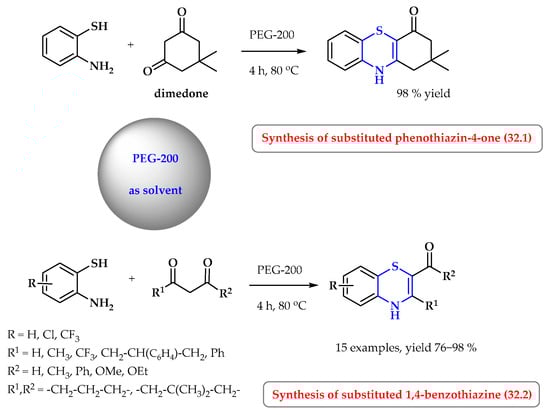 - Islam, A.; Singha, R.; Ghosh, P. Polyethylene glycol (PEG-200): An efficient, green and biocompatible reaction medium for the metal-free synthesis of functionalized 1,4-benzothiazines. ChemistrySelect 2023, 8, e202203780. [Google Scholar] [CrossRef]