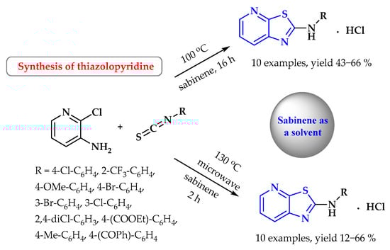 - Messire, G.; Ferreira, V.; Caillet, E.; Bodin, L.; Auville, A.; Berteina-Raboin, S. Sabinene: A new green solvent used in the synthesis of thiazolo[5,4-b]pyridines by thermal or microwave activation. Molecules 2023, 28, 6924. [Google Scholar] [CrossRef] [PubMed]