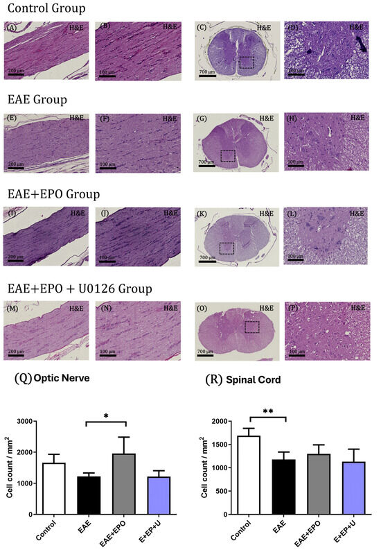 Figure 1. Histology of the control’s optic nerve and spinal cord tissues, EAE, EAE+EPO, and EAE+EPO+U0126 groups. These tissues were stained using the hematoxylin and eosin technique. (A) Optic nerve of the control group with 10× magnification; (B) optic nerve of the control group with 40× magnification; (C) spinal cord of the control group with 3× magnification; (D) spinal cord of the control group with 20× magnification; (E) optic nerve of the EAE group with 10× magnification; (F) optic nerve of the EAE group with 40× magnification; (G) spinal cord of the EAE group with 3× magnification; (H) spinal cord of the control group with 20× magnification; (I) optic nerve of the EAE+EPO group with 10× magnification; (J) optic nerve of the EAE+EPO group with 40× magnification; (K) spinal cord of the EAE+EPO group with 3× magnification; (L) spinal cord of the EAE+EPO group with 20× magnification; (M) optic nerve of the EAE+EPO+U0126 group with 10× magnification; (N) optic nerve of the EAE+EPO+U0126 group with 40× magnification; (O) spinal cord of the EAE+EPO+U0126 group with 3× magnification; (P) spinal cord of the EAE+EPO+U0126 group with 20× magnification; (Q) graph of the cell count in the optic nerve of the study groups; (R) graph of the cell count in the spinal cord of the study groups. The data are presented as mean ± SD obtained for the four animals per group. A one-way ANOVA and a Tukey post hoc test were performed as a statistical test. The significant differences are * p < 0.053 EAE vs. EAE+EPO for the optic nerve and ** p < 0.016 control vs. EAE in the spinal cord.