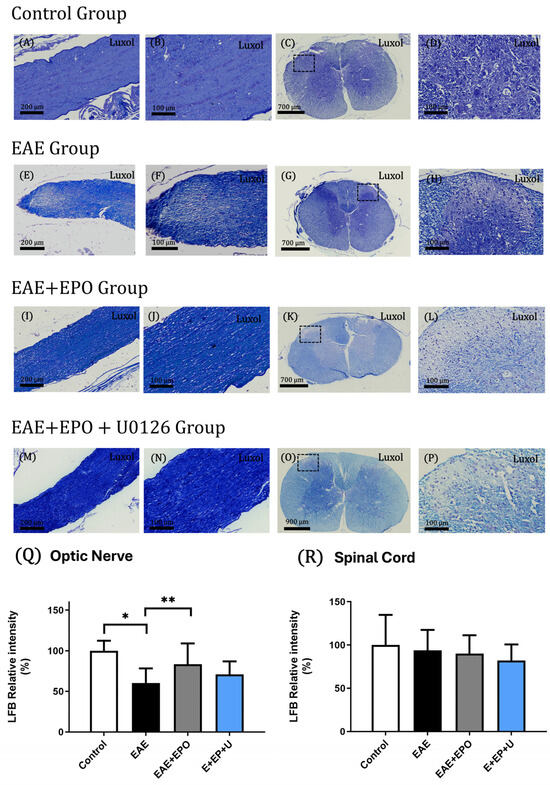 Figure 2. Histology of the control’s optic nerve and spinal cord tissues, EAE, EAE+EPO, and EAE+EPO+U0126 groups. These tissues were stained using the Luxol Fast Blue technique. (A) Optic nerve of the control group with 10× magnification; (B) optic nerve of the control group with 20× magnification; (C) spinal cord of the control group with a 2.5× magnification; (D) spinal cord of the control group with 20× magnification; (E) optic nerve of the EAE group with 10× magnification; (F) optic nerve of the EAE group with 20× magnification; (G) spinal cord of the EAE group with 2.5× magnification; (H) spinal cord of the control group with 20× magnification; (I) optic nerve of the EAE+EPO group with 10× magnification; (J) optic nerve of the EAE+EPO group with 20× magnification; (K) spinal cord of the EAE+EPO group with 2.5× magnification; (L) spinal cord of the EAE+EPO group with 20× magnification; (M) optic nerve of the EAE+EPO+U0126 group with 10× magnification; (N) optic nerve of the EAE+EPO+U0126 group with 20× magnification; (O) spinal cord of the EAE+EPO+U0126 group with 2.5× magnification; (P) spinal cord of the EAE+EPO+U0126 group with 20× magnification; (Q) graph of the LFB relative intensity in the optic nerve of the study groups; (R) graph of the LFB relative intensity in the spinal cord of the study groups. The data are presented as mean ± SD obtained for the four animals per group. A one-way ANOVA and a Tukey post hoc test were performed as a statistical test. The significant differences are * p < 0.00007 control vs. EAE and ** p < 0.003 EAE vs. EAE+EPO for optic nerve.