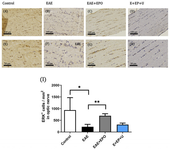 Figure 3. Immunohistochemistry of the ERK protein. Positive expression of ERK+ protein of cells in the optic nerve tissue; (A) positive ERK expression in the optic nerve of the control group at 10× magnification; (E) ERK+ expression in the optic nerve of the control group at 40× magnification; (B) positive ERK expression in the optic nerve of the EAE group at 10× magnification; (F) ERK+ expression in the optic nerve of the EAE group at 40× magnification; (C) positive ERK expression in the optic nerve of the EAE+EPO group at 10× magnification; (G) ERK+ expression in the optic nerve of the EAE+EPO group at 40× magnification; (D) positive ERK expression in the optic nerve of the EAE+EPO+U0126 group at 10× magnification; (H) ERK+ expression in the optic nerve of the EAE+EPO+U0126 group at 40× magnification; (I) graph of the ERK+ expression in neuronal cells in the optic nerve of the study groups. The data are presented as mean ± SD for the four animals per group. A one-way ANOVA and a Tukey post hoc test were performed as a statistical test. The significant differences are * p < 0.0013 control vs. EAE and ** p < 0.014 EAE vs. EAE+EPO for optic nerve.