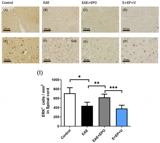 Figure 4. Immunohistochemistry of the ERK protein. Positive expression of ERK+ protein of neuronal cells in the spinal cord tissue; (A) positive ERK expression in the spinal cord of the control group at 10× magnification; (E) ERK+ expression in the spinal cord of the control group at 40× magnification; (B) positive ERK expression in the spinal cord of the EAE group at 10× magnification; (F) ERK+ expression in the spinal cord of the EAE group at 40× magnification; (C) positive ERK expression in the spinal cord of the EAE+EPO group at 10× magnification; (G) ERK+ expression in the spinal cord of the EAE+EPO group at 40× magnification; (D) positive ERK expression in the spinal cord of the EAE+EPO+U0126 group at 10× magnification; (H) ERK+ expression in the spinal cord of the EAE+EPO+U0126 group at 40× magnification; (I) graph of the ERK+ expression in neuronal cells in the spinal cord of the study groups. The data are presented as mean ± SD for the four animals per group. A one-way ANOVA and a Tukey post hoc test were performed as a statistical test. The significant differences are * p < 0.0008 control vs. EAE, ** p < 0.021 EAE vs. EAE+EPO, and *** p < 0.0026 EAE+EPO vs. E+EP+U for spinal cord.