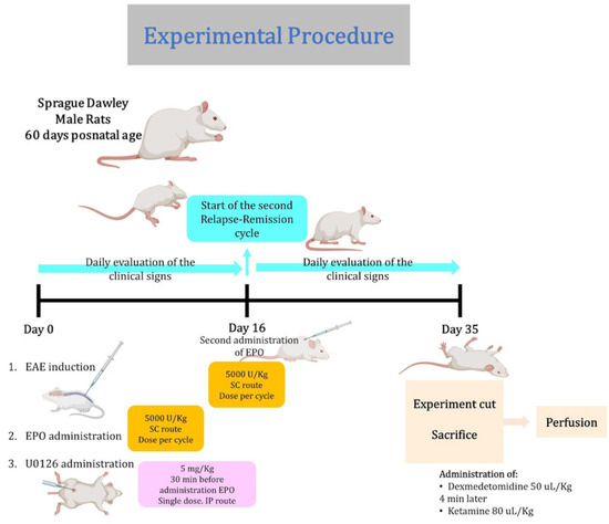 The induction of the EAE model was carried out according to the following technique. A total of 150 μL of the immunization emulsion was administered subcutaneously and prepared with a 1:1 homogenate of the spinal cord and pig brain, which were sources of neuroantigens, and resuspended in a proportion 1:2 Freund’s complete adjuvant. The biological material (pig spinal cord and brain) was obtained from healthy animals [27]. On experimental day 0, each rat was immunized with the immunization emulsion described above. The animals were monitored and evaluated daily throughout the experimental period. The study model of this research work is the type of EAE that resembles relapsing–remitting multiple sclerosis (Figure 5).